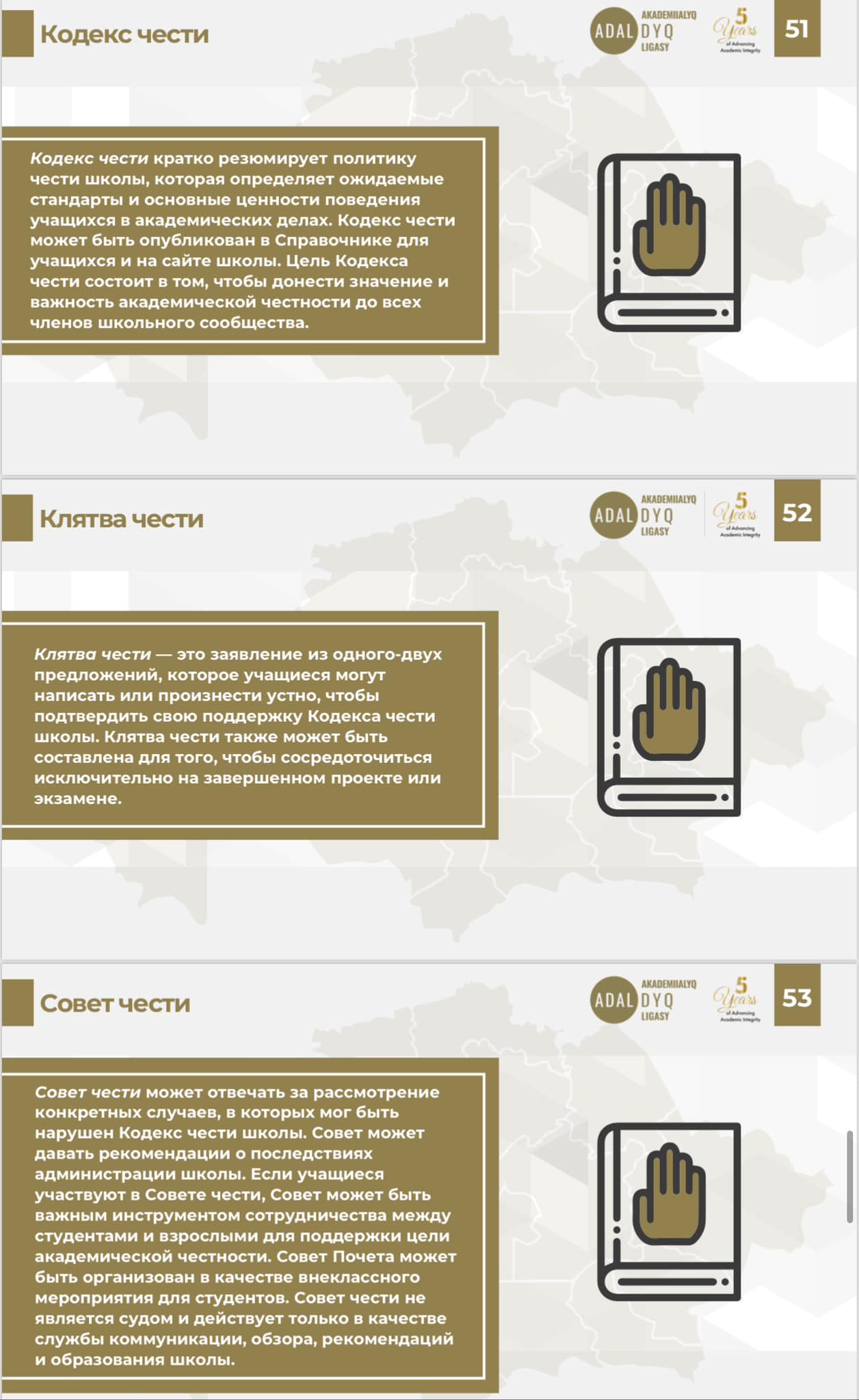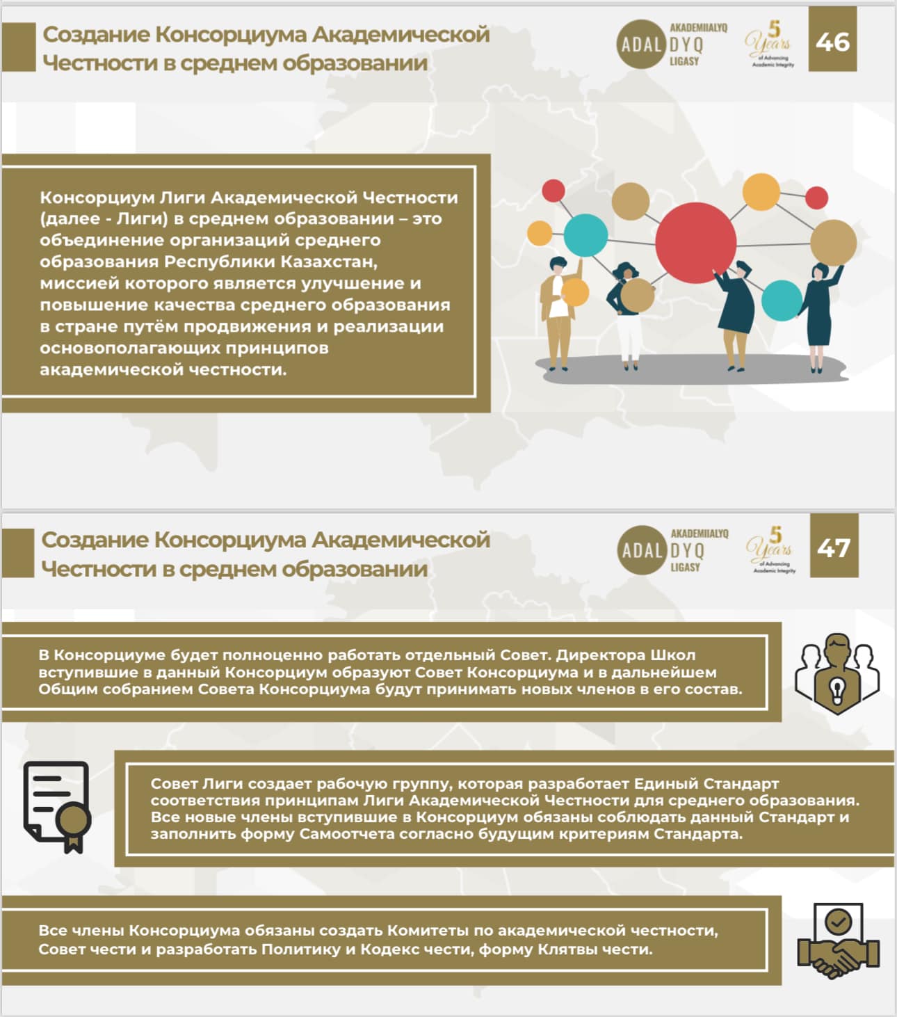 · Қатысушылардың міндеттемелері: Консорциумға кіретін мектептер Академиялық адалдық комитеттерін құруы, стратегиялық жоспарлар құруы және оқушыларды Ар-намыс анты түрінде қабылдауға міндеттеуі керек.